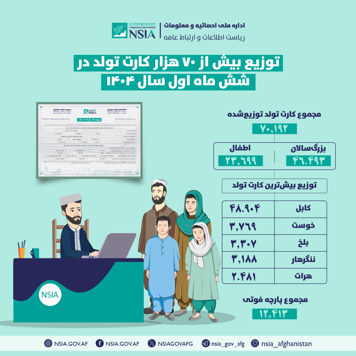 اداره ملی احصائیه و معلومات در شش ماه نخست سال ۱۴۰۴، برای ۷۰ هزار و ۱۹۲ شهروند در سراسر کشور کارت تولد صادر و توزیع کرده است.