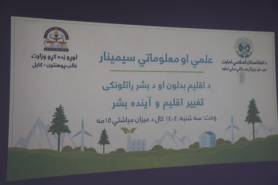 ادارهی ملی حفاظت محیط زیست امارت اسلامی روز (سهشنبه، ۱۵ میزان) در کابل سمینار علمی – معلوماتی تحت عنوان «تغییر اقلیم و آیندهی بشر» را برگزار کرد. در این رویداد، گروهی از مقامات امارت، استادان دانشگاهها و دانشجویان حضور داشتند.