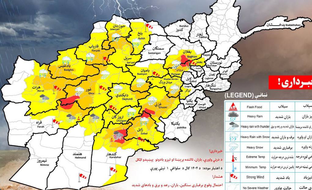 بر اساس خبرنامه‌ای که این ریاست روز سه‌شنبه، ۳۰ جدی منتشر کرده، این وضعیت جوی از فردا در ولایت‌های بلخ، فاریاب، سرپل، جوزجان، بادغیس، هرات، فراه، غور، هلمند، قندهار، ارزگان، دایکندی، بامیان، زابل، غزنی، میدان‌وردک، لوگر، پروان، پنجشیر و بغلان به‌شمول مسیرهای سالنگ پیش‌بینی شده است.