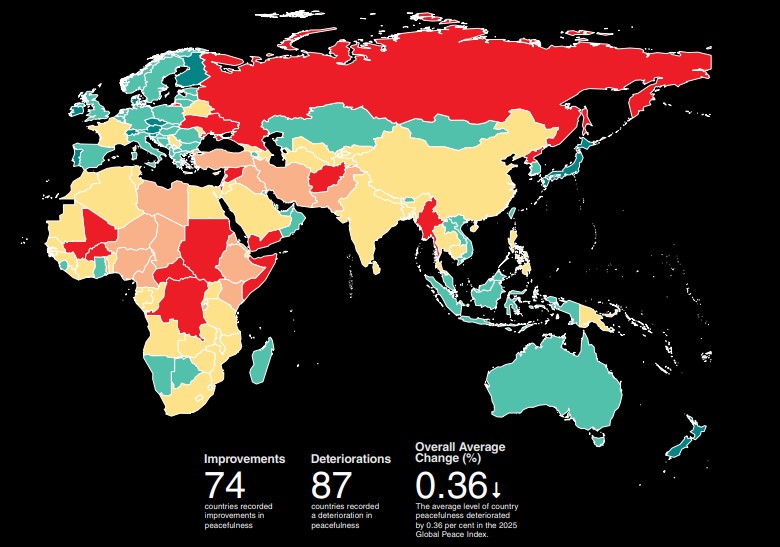 در بخش دیگری از گزارش آمده است که جهان در سال ۲۰۲۵ برای سیزدهمین بار طی ۱۷ سال گذشته با کاهش سطح صلح مواجه شده و نشانه‌های هشداردهنده پیش از بروز درگیری‌های بزرگ، به بالاترین حد خود از زمان پایان جنگ جهانی دوم رسیده است.